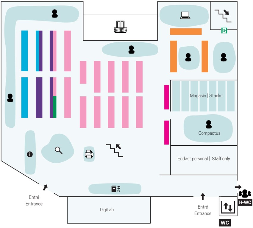 I bibliotekets lokaler hittar du allt från studieplatser, skrivare, datorplatser, hiss, mm. Toaletter hittar du vid grupprummen utanför bibliotekets lokaler, på D2.
