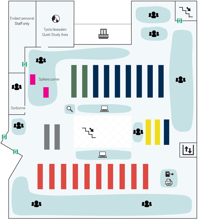 Detta kan du hitta på våra kartor längre ner på sidan: Nödutgång, tysta studieplatser, balkong, hiss, infodisk, studieplatser för grupp, väntehylla, sökdator, skrivare, enskild studieplats, låneautomat samt datorarbetsplats.