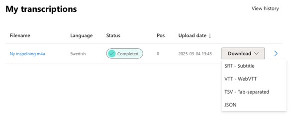 6. Tryck sedan på ”Send for transcription” så hamnar du på startsidan igen. Nu har din fil dykt upp under ”My transcriptions” med aktuell status. När transkriberingen är färdig visas den som ”Completed” och du kan välja vilket filformat du vill ladda ner din transkribering i.